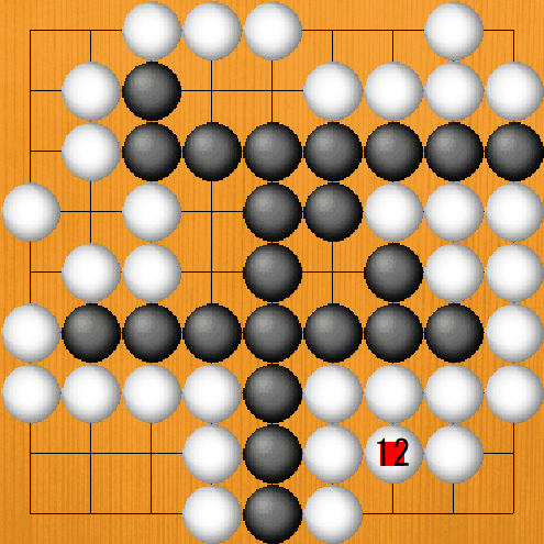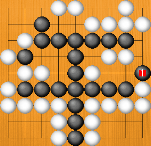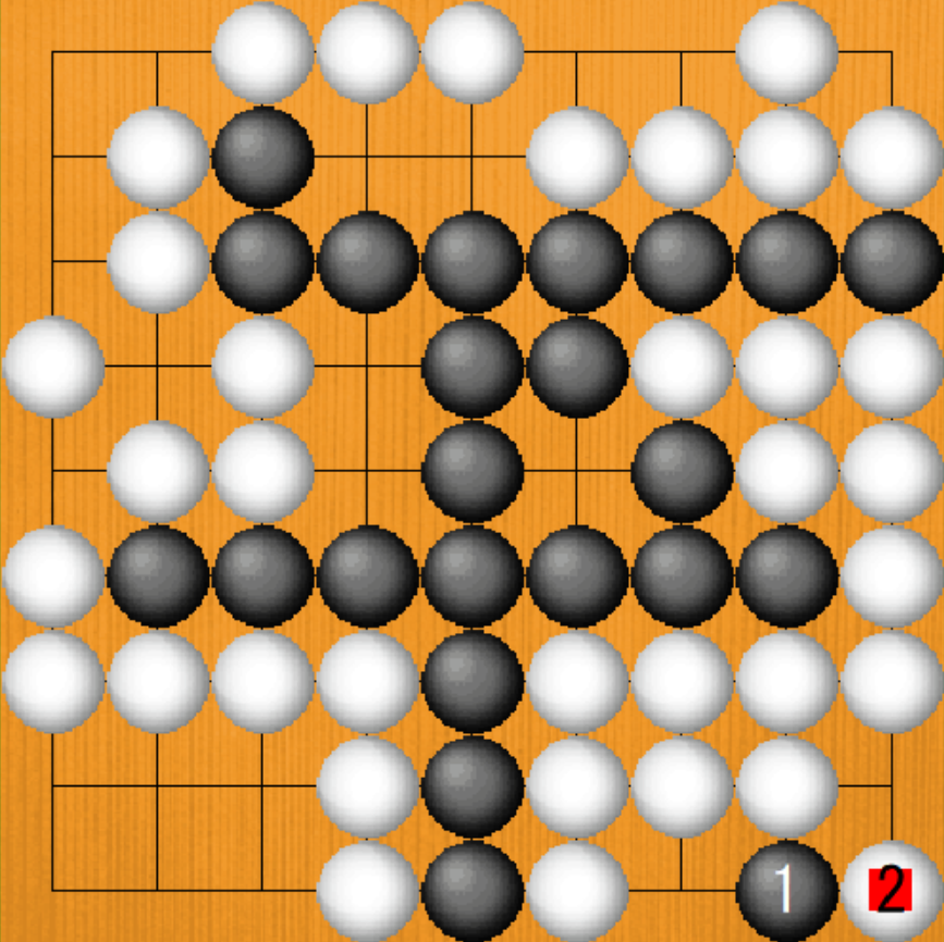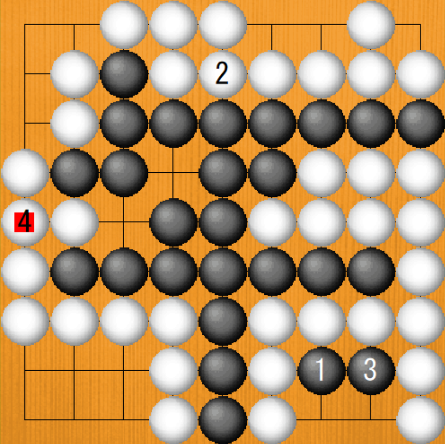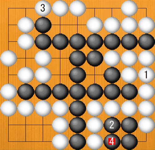 黒1と四目中手にして白はあと四手。白2と詰められて黒は三手。黒3に白4で黒が一手負け。