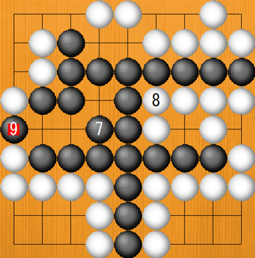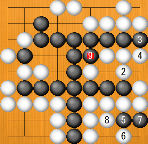 黒1ツギは失敗。白2と換わって黒の手数が一手短くなる。正解と同様に黒3から白6に続いて黒7と一眼作ったとき、白8でこちらの眼を奪われる。黒9と抜き――