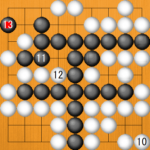 黒1が正解。白2と切らせて黒3。白4と換わり、黒5とツケて応手を問う。白6のツケで生きれば、黒7から9が先手で一眼を確保。黒11から13であと一眼を作って生き。