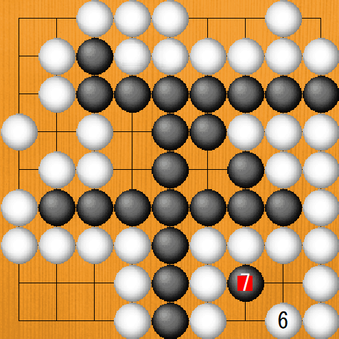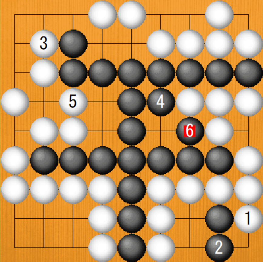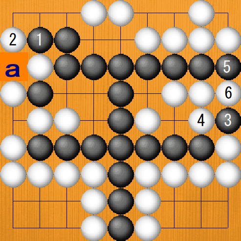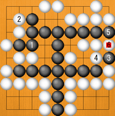 黒のツケに白1と応じれば黒2で中手にする。白3と詰めて攻め合い。黒4から6に続いて――