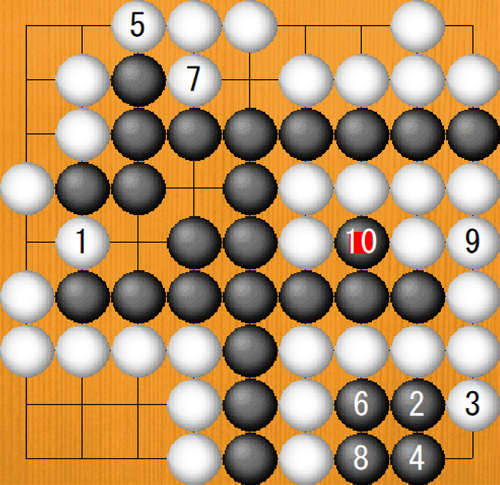 白1と抜き返し、黒2のツケに白3で攻め合い。無条件で白を取ろうとするなら黒4で四目中手。白5、7に黒6、8と詰め合い、白9ツギに黒10アテ。白11と四子を取り――